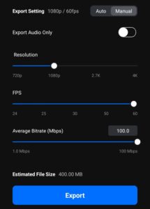 VN App में Cinematic Video Export करने के लिए आपके ऊपर साइड में Right वाले Option पर Click करना होगा फिर आप लोग के सामने तीन Option देखने को मिलेगा Resolution,FPS, Average Bitrate ( Mbps )